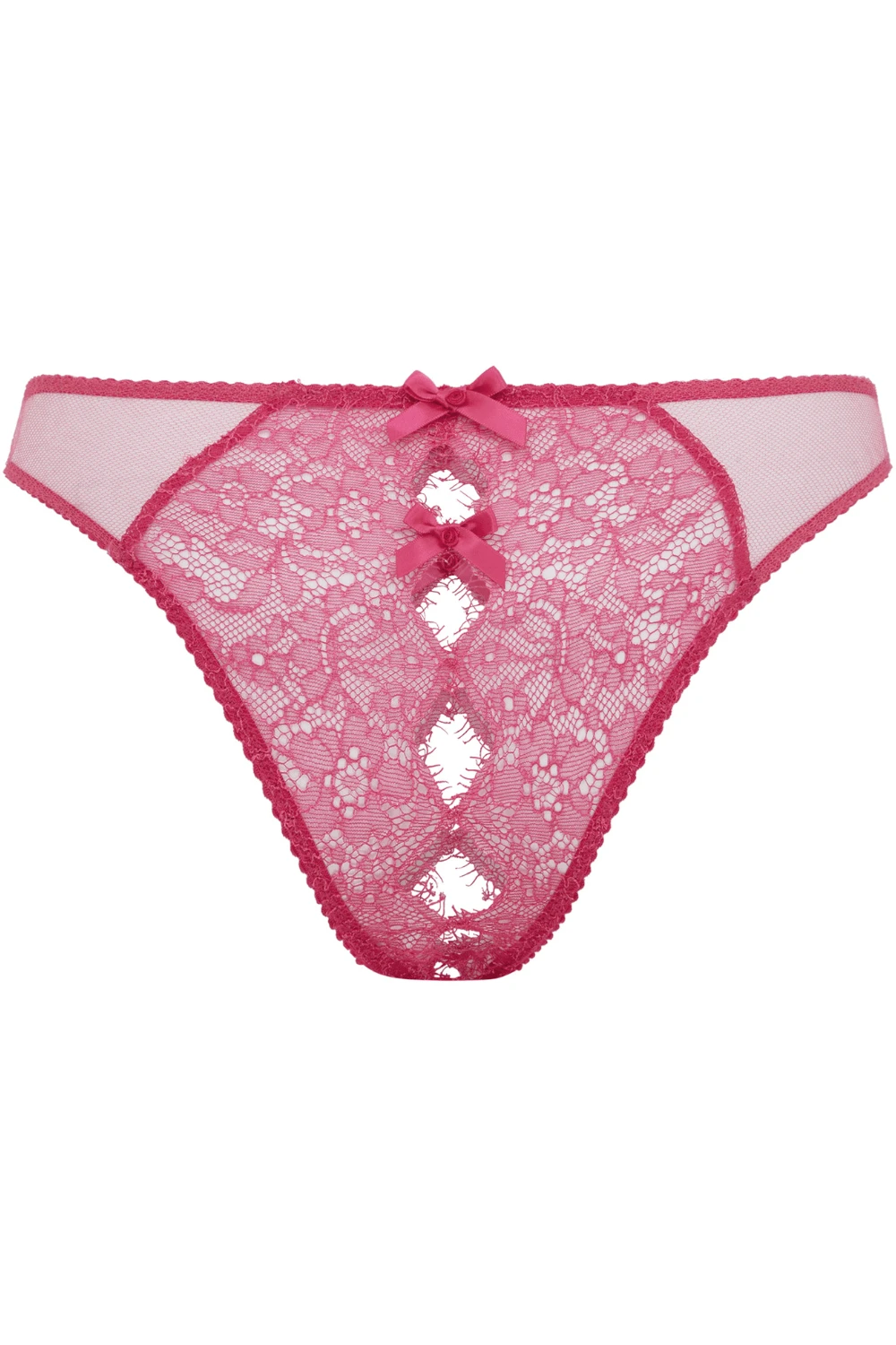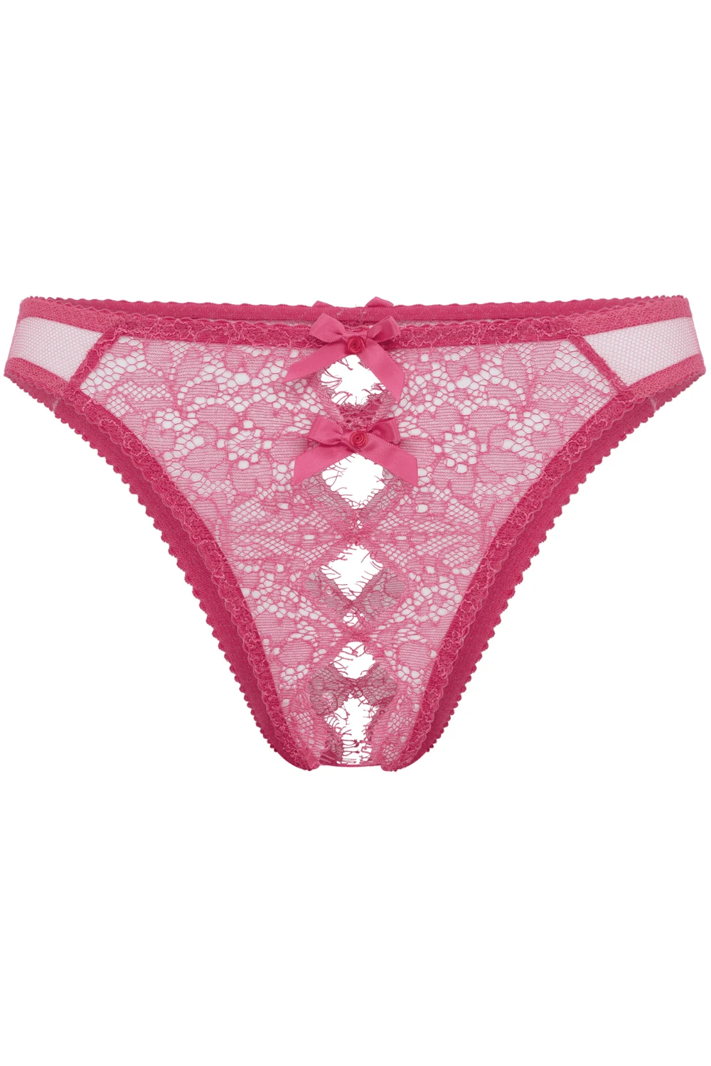 Playful and provocative indulge in the Lorna ouvert brief from Agent Provocateur. Crafted from floral lace with Austrian embroidery and French seam detailing, it features sheer mesh on the hips. The playful scalloped design creates a naughty open gusset. Wear yours with the wearing Lorna Plunge Bra or with gold pasties.