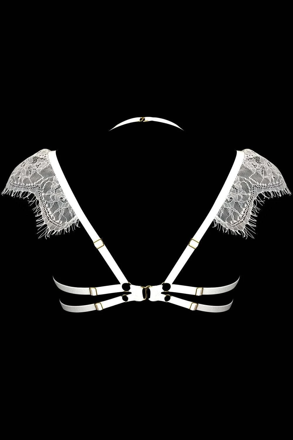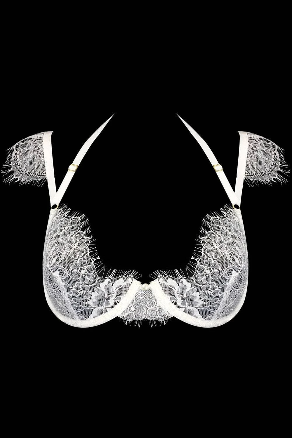 Inspired by 60’s silhouettes and feminine flourishes the ‘Chantilly Vanille’ shoulder bra is made from premium floral scalloped lace, with eyelash trim. The adjustable back wing that features gold-plated hardware detailing. The floral embroidery is timeless and elegant and provides all-day comfort. The centre front is embellished with a small freshwater pearl for a hint of vintage glamour.