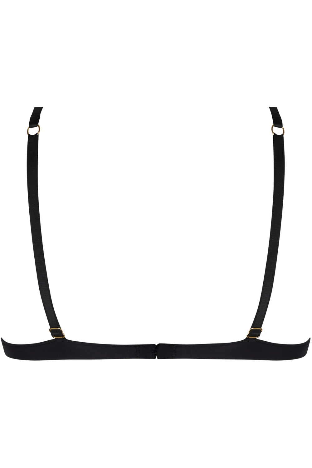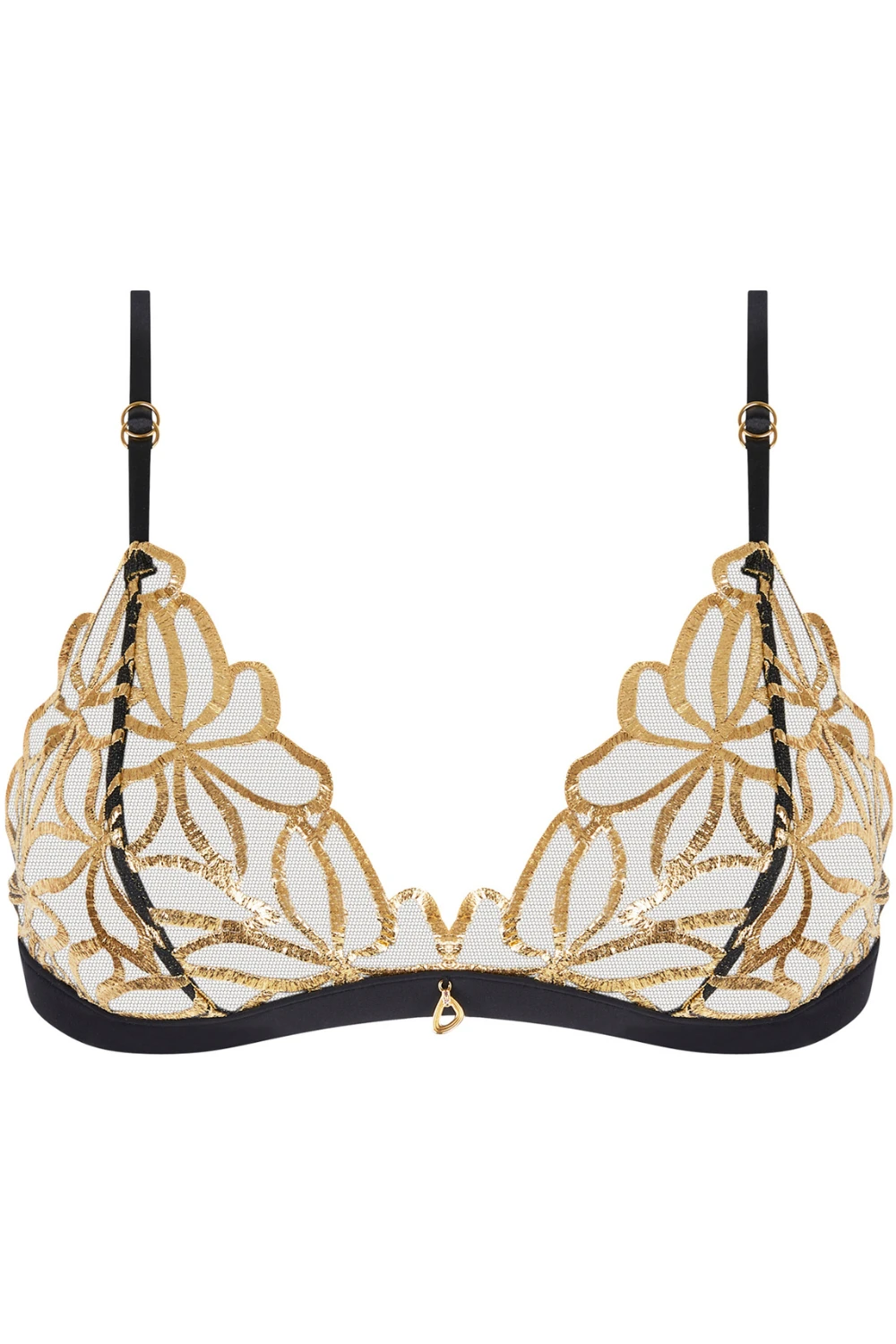 Introducing the Éclats d’Or Triangle Bra by Lise Charmel, a stunning blend of luxury and comfort. This soft, non-wired bra features a light and comfortable triangular shape that beautifully supports and flatters your figure. The cups are adorned with exquisite gold laminated scalloped embroidery, adding a touch of elegance to your lingerie collection. The back is crafted from plain mesh for a smooth fit, while a double golden ring jewel decorates the front straps, infusing a hint of glamour into your everyday wear.