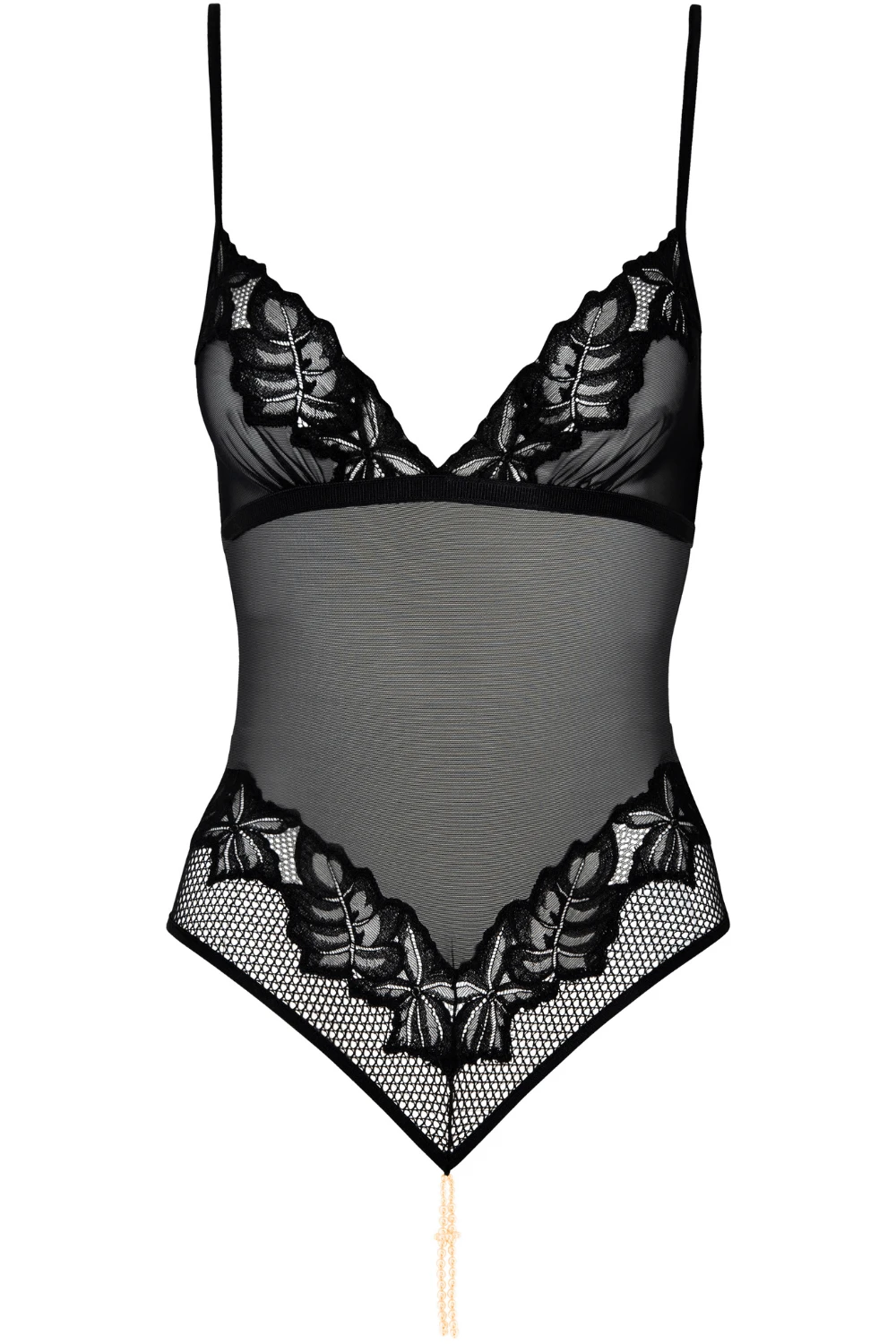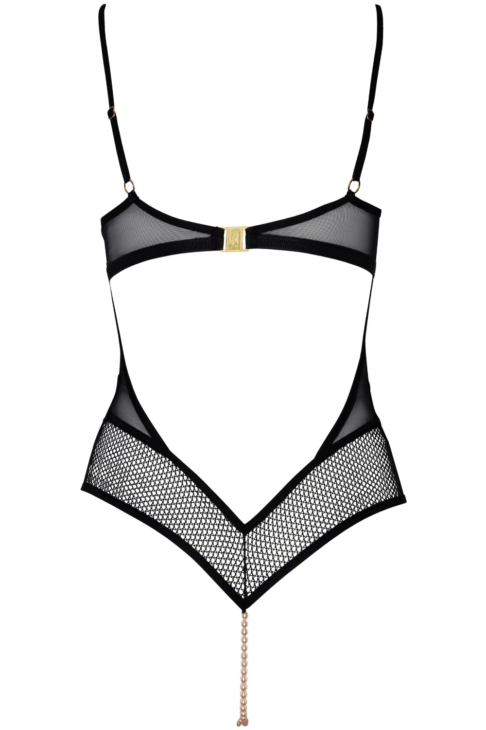 Sheer lingerie by Bracli. The London body is both elegant yet unforgettably sexy. Sheer mesh and delicate Leavers lace hug the female silhouette beautifully while a double string of pearls stimulates the most sensitive parts of the woman for endless pleasure. Style with lace hold-up for an elegant look.