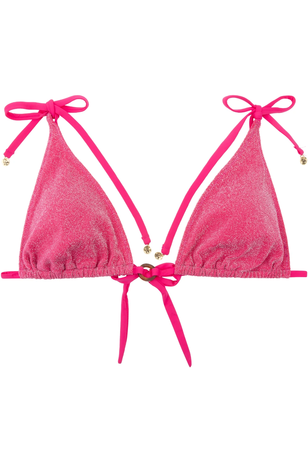 The Jolly Triangle Bikini Top from Love Stories is the perfect addition to your beach wardrobe. Made from glittery lurex fabric, it features removable padding and triangle cups. An acetate ring detail sides at the centre front. The adjustable shoulder straps are finished with gold coins stamped with the Love Stories logo.