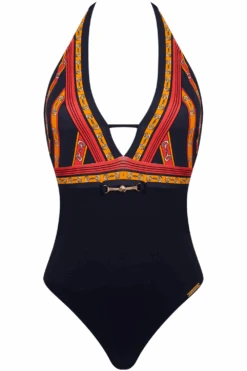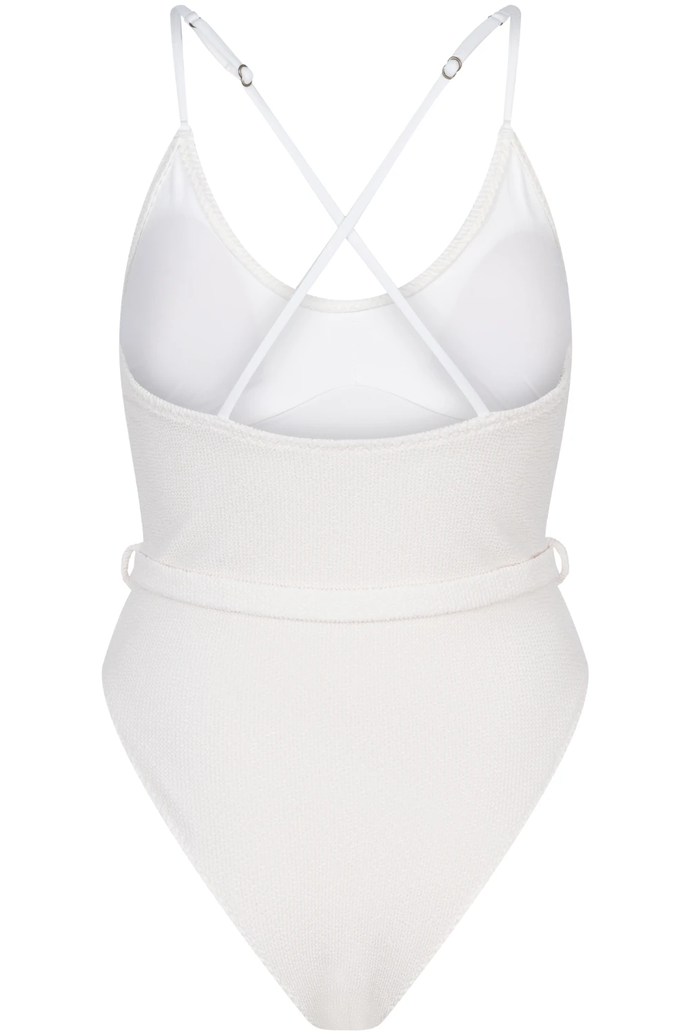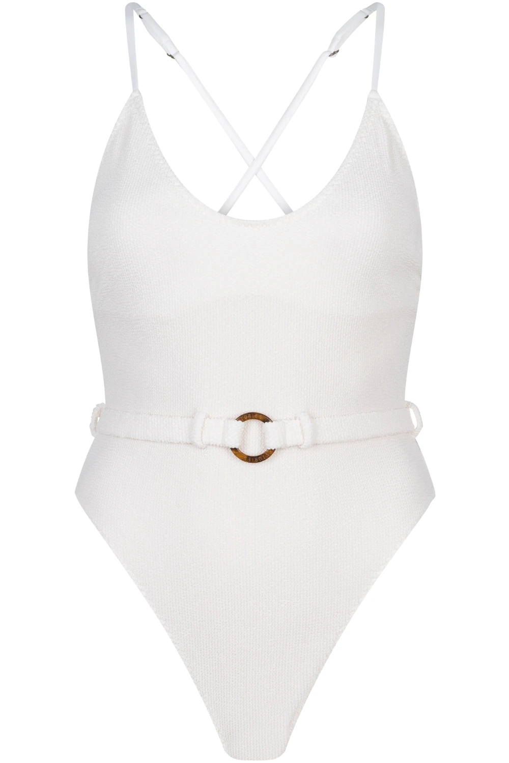 The Madison Swimsuit from Love Stories is the ultimate fusion of style and comfort. Made from soft, stretch fabric with a textured, crinkle finish, it features a gently rounded neckline and a circular buckle in tortoise acetate. The extra lining layer ensures no transparency, while the slender, adjustable shoulder straps criss-cross at the back for a perfect fit. The high-cut leg line subtly elongates your legs, making you feel confident and chic.