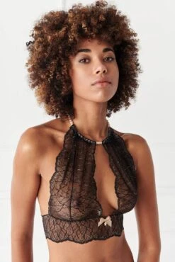 Comfortable, elegant and tempting, discover the Sydney Bralette. This luxury bra is made from soft, black Italian lace with golden lurex highlights, combined with cream Pearls of Manacor. A pearl choker and a suggestive neckline, make this piece both sexy and alluring. The cups are unlined and unwired for light support. Style yours with one of the matching black Sydney thongs for a striking statement.